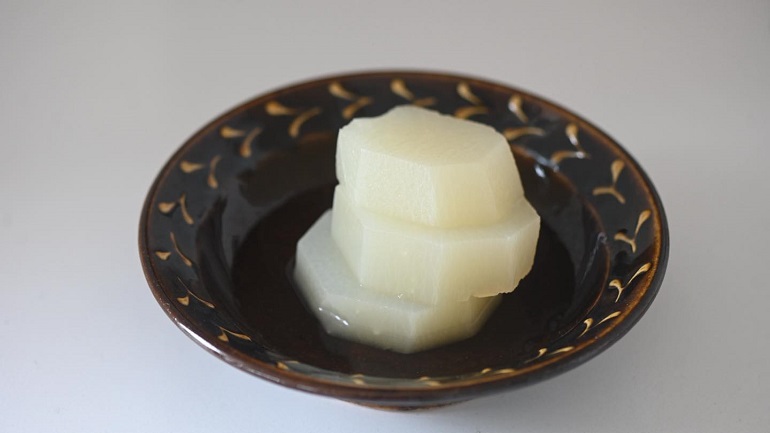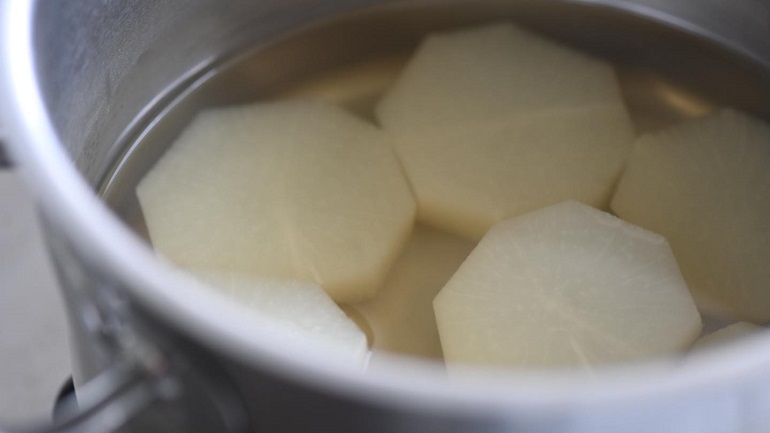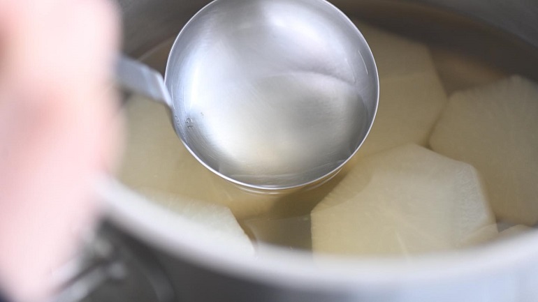 男主角下廚時,一刀一刀仔細地切蘿蔔,仔細的用傳統的柴魚片和昆布控湯,還特地前一天就先煮好,然後用布包著鍋子放一夜。