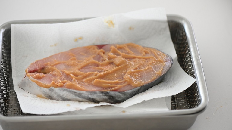 像現在馬加魚的季節,猩弟就是挖一點味噌,兑一點清酒把它稀釋一下,直接塗在魚肉上,再用廚房紙巾包起來,放進冰箱,讓魚肉就像敷著面膜一樣,好好睡一夜。