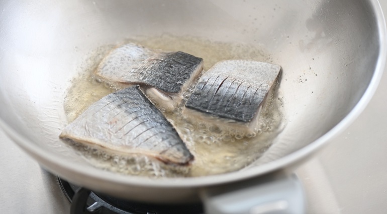 回到油量這件事,如果煎魚時油太少,魚肉比較厚的地方很容易不熟,魚在鍋子裡的時間就會被迫拉長,最後魚肉乾乾的、口感不好,真的會很可惜。