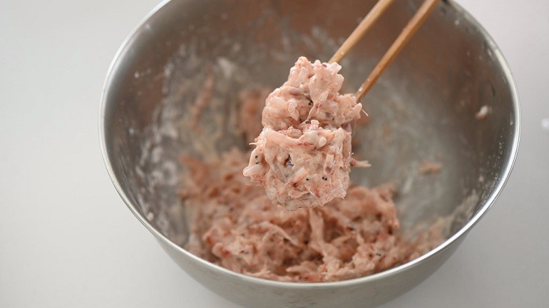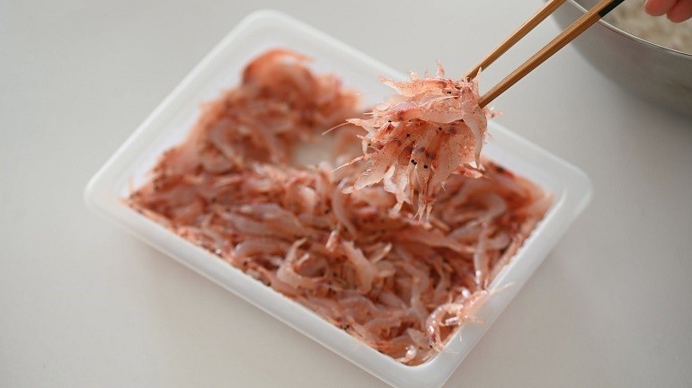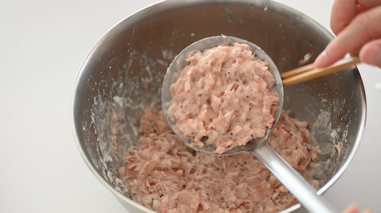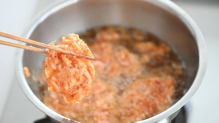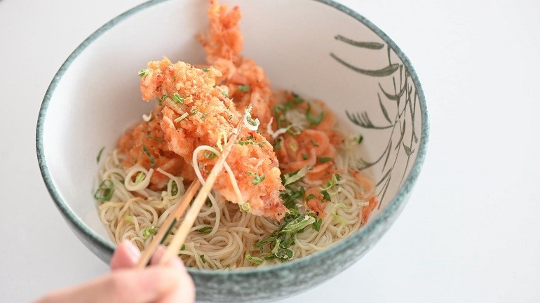 既然是自己要吃,猩弟就想說不如加點料,直接把我們宜蘭產的「純生」急速冷凍櫻花蝦拿出來,拌上天婦羅粉和水,調成有點黏稠的半液體狀之後下鍋油炸。想做的是那種在日本吃烏龍麵時,上面會放的炸物口感,一部分吃起來是酥脆的麵衣,一部分吸附湯汁之後又變成另一種風味,就想試試看這樣搭起來會不會合。