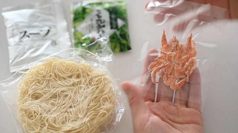 回到台灣的第二天,馬上把這次考察帶回來的櫻花蝦素麵拆開來試試看。第一次看到用「泡」的麵線,其實心裡多少有點懷疑,真的有辦法泡熟嗎?打開之後內容其實很單純,沒有什麼花俏的設計,就是櫻花蝦乾、一包醬汁,還有乾燥的青蔥,看起來簡單到甚至有一點寂寞。