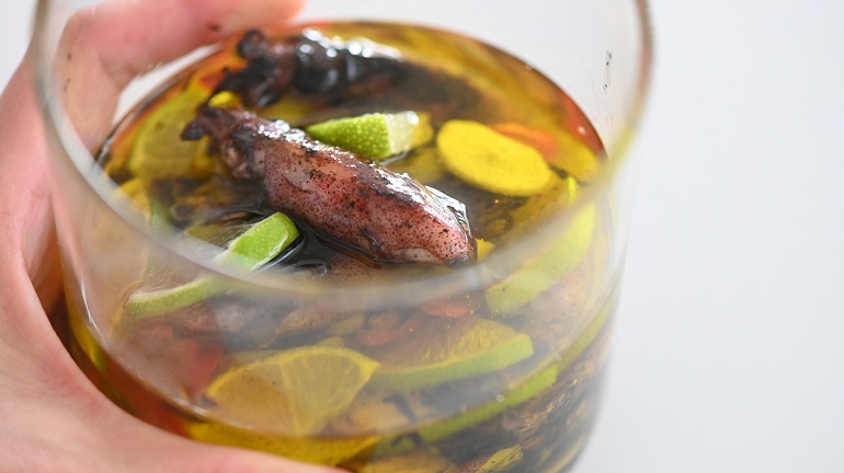其實這也是一種剩菜處理啦。小卷煎一煎吃不完,猩弟就找個容器裝起來,切一點蒜頭片、生辣椒,加上一點鹽巴,最後倒橄欖油封起來,放一個晚上。