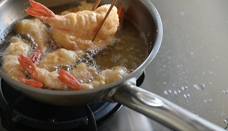 結果搞到晚餐時間都延誤,最後只好炸幾隻草蝦,用白飯包成飯糰草草吃。