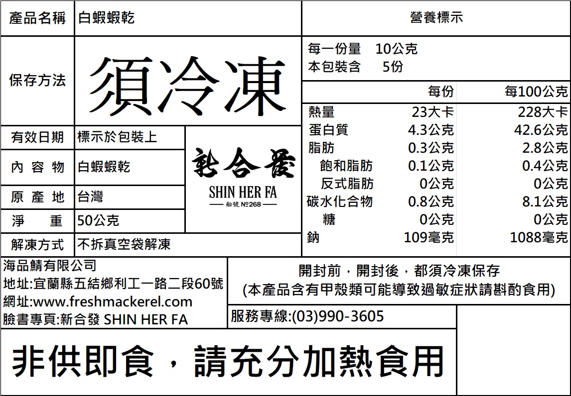 備註:每包白蝦蝦乾大小、尾數不一,但每包實重皆達50克重。