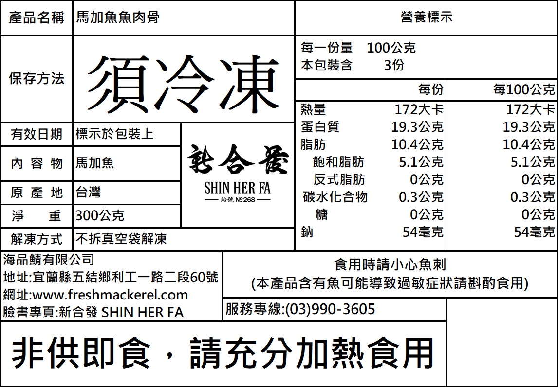 備註:每包馬加魚肉骨大小、塊數不一,但每包實重皆達300公克重。