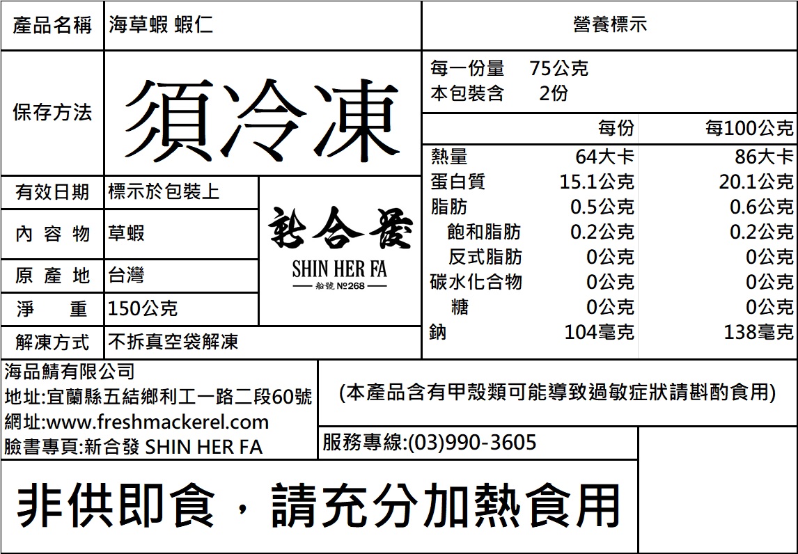 備註:每包海草蝦 蝦仁大小、尾數不一,但每包實重皆達150克重。