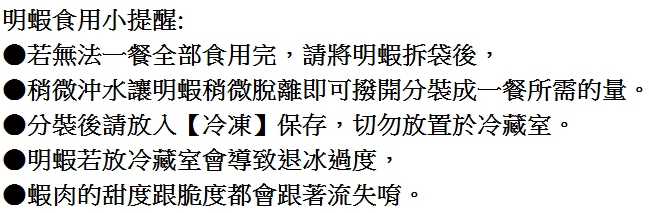*此商品每袋均足重1KG以上,每尾明蝦規格大小不等,每袋內規格均為隨機搭配。(因為要控制隻數和重量,一盒裡面如有搭配一尾或兩尾稍小一點的,此為正常現象,不然會超重太多)