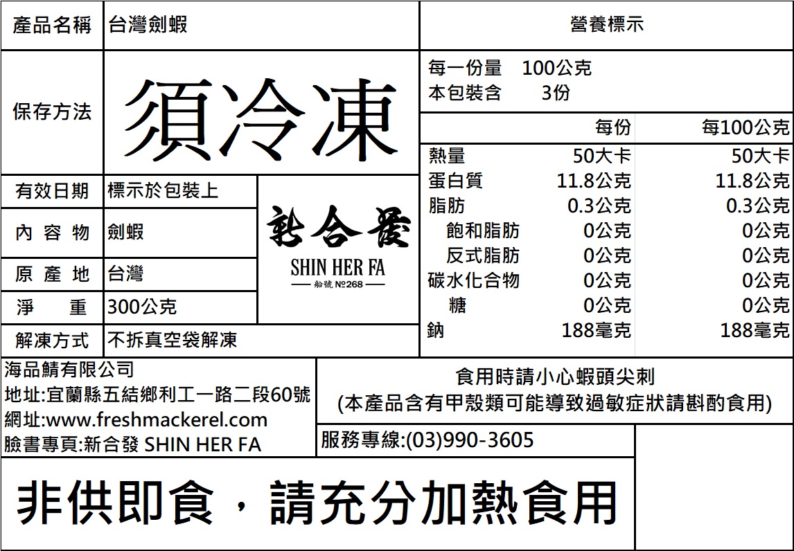 備註:每包劍蝦大小、尾數不一,但每包實重皆達300克重。