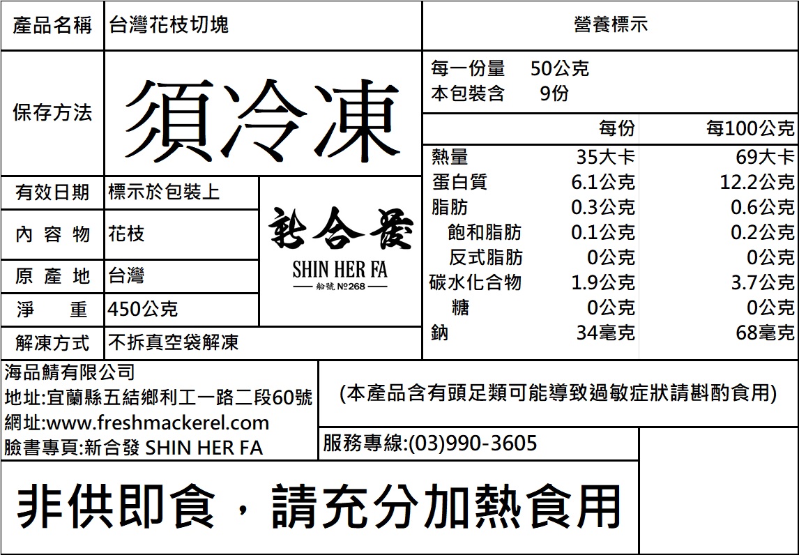 備註:每包花枝大小、塊數不一,但每包實重皆達標示公克重。
